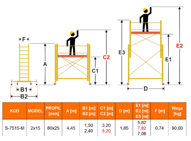 Visina se podešava svakih 25 cm pomoću sustava sajli i kolutova, a podesive noge i stabilizatori dodatno ukrućuju i stabiliziraju skelu.