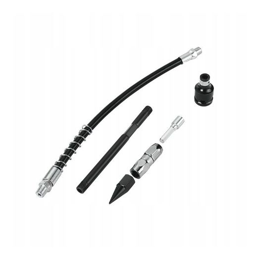 - fleksibilno crijevo, uključeno u set, ključno je za postizanje preciznosti – omogućuje pouzdano podmazivanje ležajeva, zglobova i drugih kritičnih mazivih točaka koje su često nedostupne krutim glavama