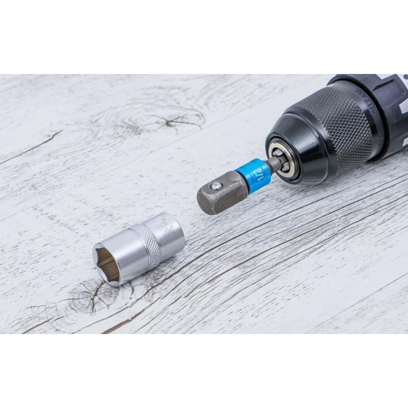 Set pokriva pogone: 1/4" (6,3 mm), 3/8" (10 mm) i 1/2" (12,5 mm), te uključuje adapter s unutarnjim šesterokutom 1/4" za direktno spajanje na bit-držač/bušilicu.
