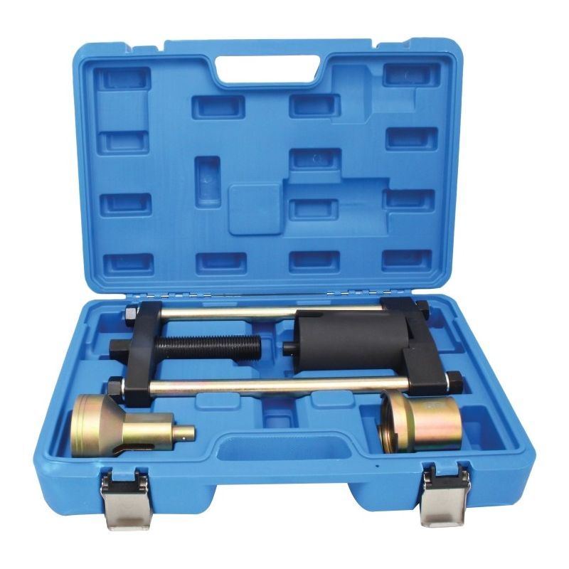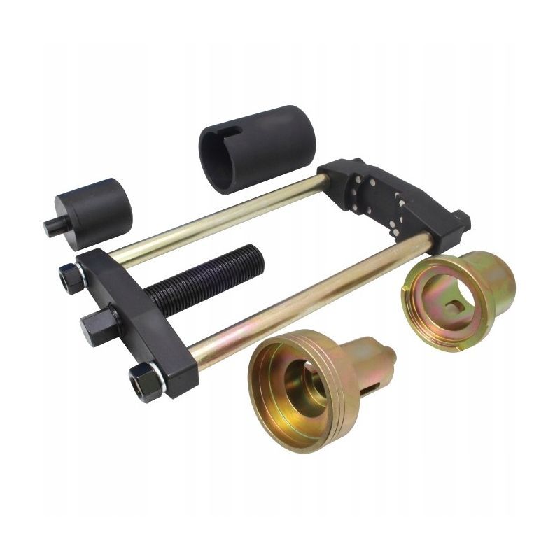 Set je namijenjen za demontažu i montažu stražnje vučne vilice (rear trailing arm bush/silent blok) bez potrebe za skidanjem cijelog mosta. Omogućuje rad direktno na vozilu uz kontrolirani pritisak.