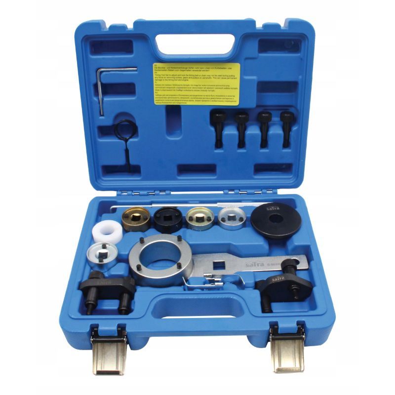 - komplet uključuje sve potrebne nastavke za rad s ventilima s varijabilnim upravljanjem, prsten za skidanje i ugradnju donjeg poklopca lanca razvoda, klinove bregastog vratila i zatezača, alat za ugradnju semeringa radilice, podloške i alat za zatezanje lanca
