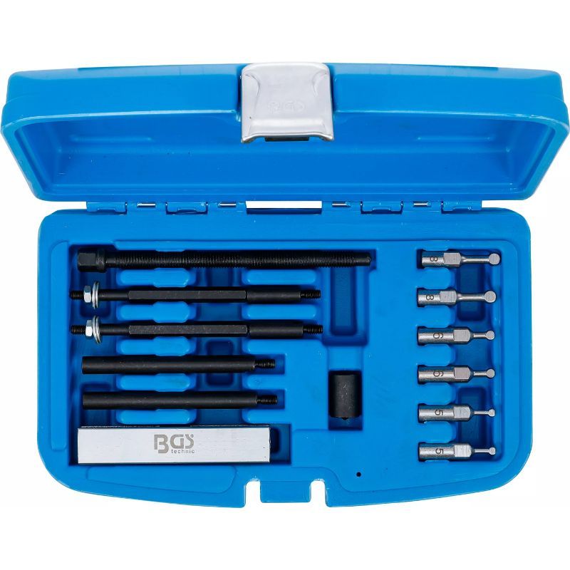 set uključuje izmjenjive glave promjera 5,5 mm, 6 mm i 8 mm, koje se postavljaju na temeljni element za izvlačenje, omogućujući prilagodbu različitim veličinama osovina i ležajeva