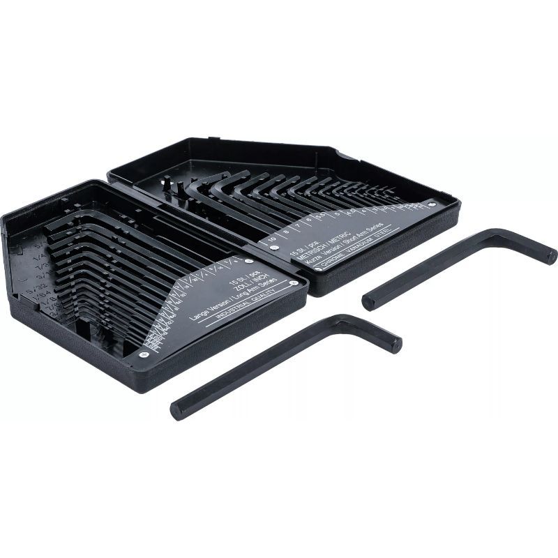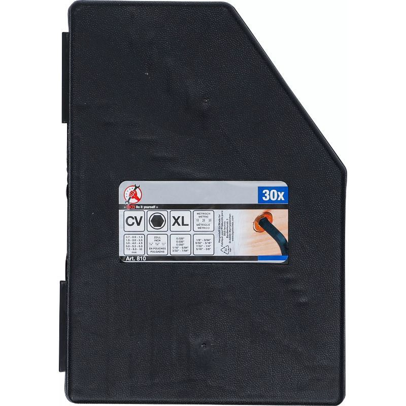 BGS 810 je set L-imbus ključeva (unutarnji šesterokut) koji pokriva metričke i inčne dimenzije, ukupno 30 komada. Namijenjen je servisnim i montažnim poslovima na vijcima s unutarnjim šesterokutom (imbus), posebno kada radite kombinaciju europskih i “inch” (imperial) standarda.