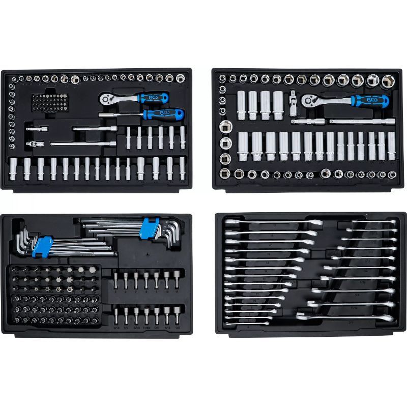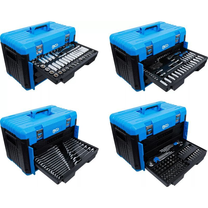 Set je namijenjen mehaničarima, servisima i zahtjevnijim DIY korisnicima kao “all-in-one” asortiman. Ukupno 300 kom uključuje nasadne ključeve, produžetke, reverzibilne čegrtaljke, T-ručku (spinner handle) i kombinirane ključeve u organiziranom koferu s ladicama, tako da je alat odmah spreman za montažne i servisne radove bez nadopune za većinu standardnih situacija.
