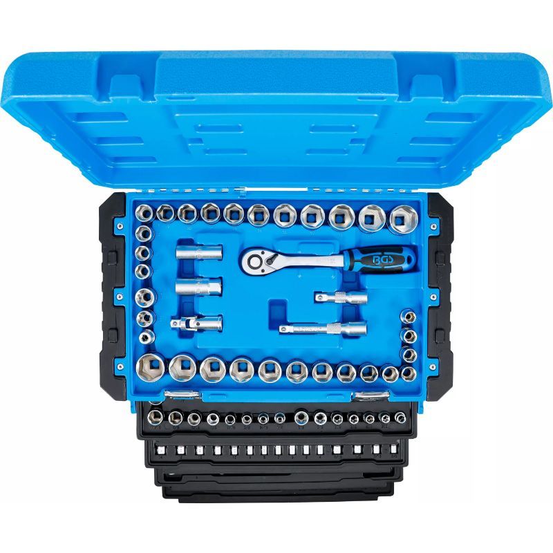 Set pokriva 6,3 mm (1/4"), 10 mm (3/8") i 12,5 mm (1/2") pogon. To je bitno jer 1/4" rješava fine i brze poslove u skučenom prostoru, 3/8" je “radni standard” za većinu servisnih zahvata, a 1/2" je za veće dimenzije i veći moment.
