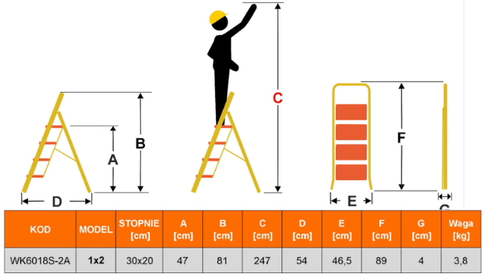 Visina do platforme iznosi 47 cm, dok maksimalna radna visina doseže približno 247 cm, ovisno o visini korisnika. To je dovoljno za većinu osnovnih kućanskih poslova na standardnim stropovima niže do srednje visine. Ovaj model je posebno praktičan kada nije potrebna veća radna visina, ali je potreban sigurniji oslonac od stolice ili improviziranih rješenja.