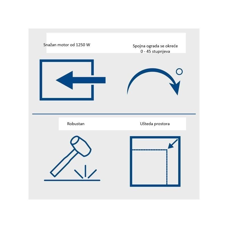 Snaga je 1250 W (S1), napajanje 220–240 V / 50 Hz. Operativno: S1 označava kontinuirani rad u nazivnim uvjetima, ali za stabilan rezultat i životni vijek uvijek je racionalno raditi u kontroliranim prolazima (ne maksimalno skidanje na tvrdom drvu).