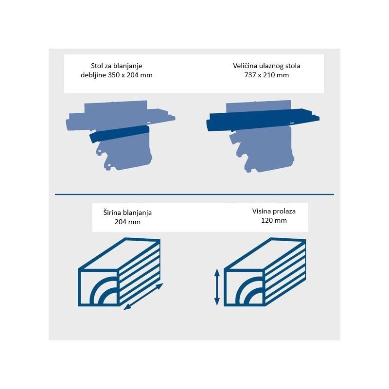 - Maksimalna širina blanjanja je 204 mm, a kapacitet debljanja je od 5 do 120 mm