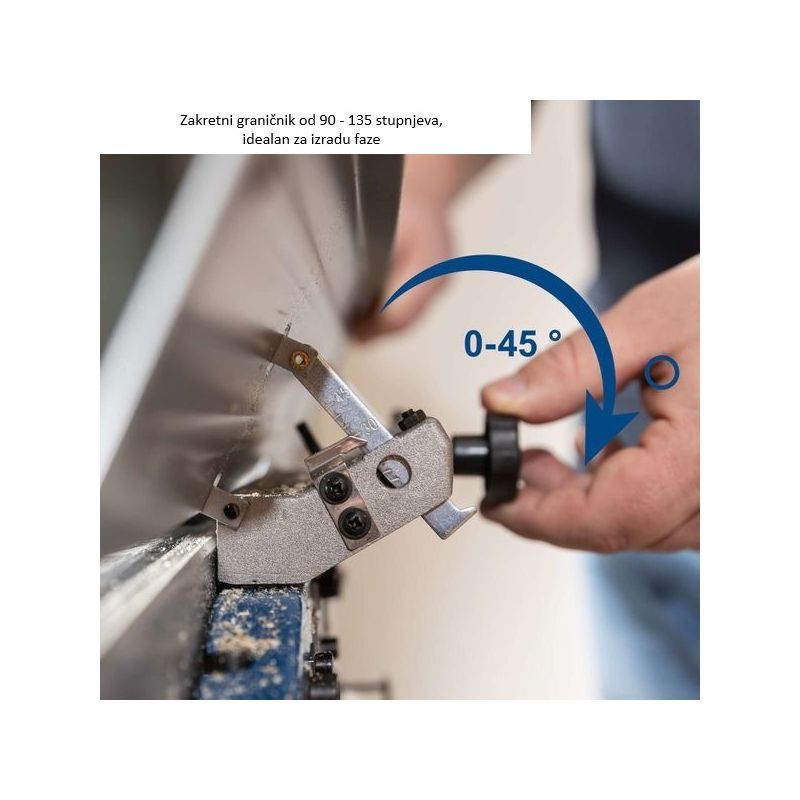 Da, ima graničnik s rasponom podešavanja kuta 90° – 45°. Operativno: koristi se za precizno blanjanje rubova pod kutom (npr. spojevi, okviri); ključ je čvrsto zaključavanje i vođenje obratka bez “valjanja” po stolu.