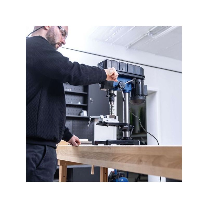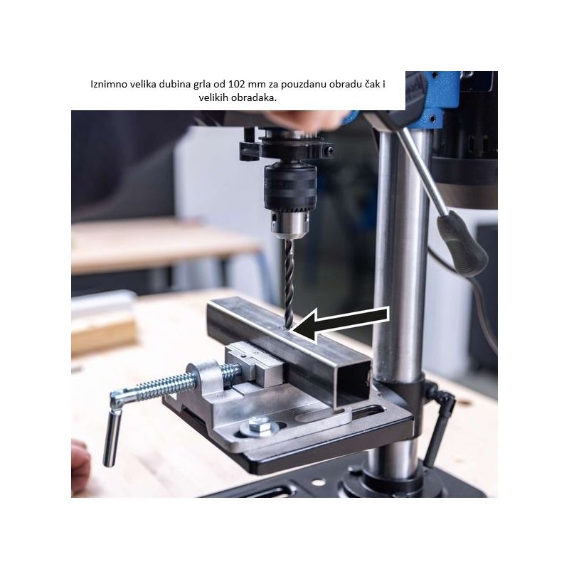 • Radni stol 164 × 162 mm rotira se 360° i naginje ±45°, te se podešava po visini za rad s različitim obradcima. Stezna glava pokriva raspon svrdla 1,5–13 mm.