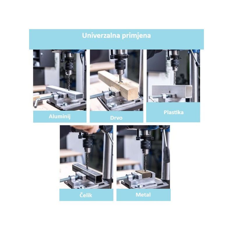 Namijenjena je za precizno bušenje u drvu, čeliku/metalu, aluminiju i plastici, posebno kada trebate ponovljivost (serijsko bušenje), kontrolu brzine i stabilnost stupa. Tipično se koristi u hobi i radioničkim uvjetima za izradu nosača, pločica, profila i stolarskih spojeva.