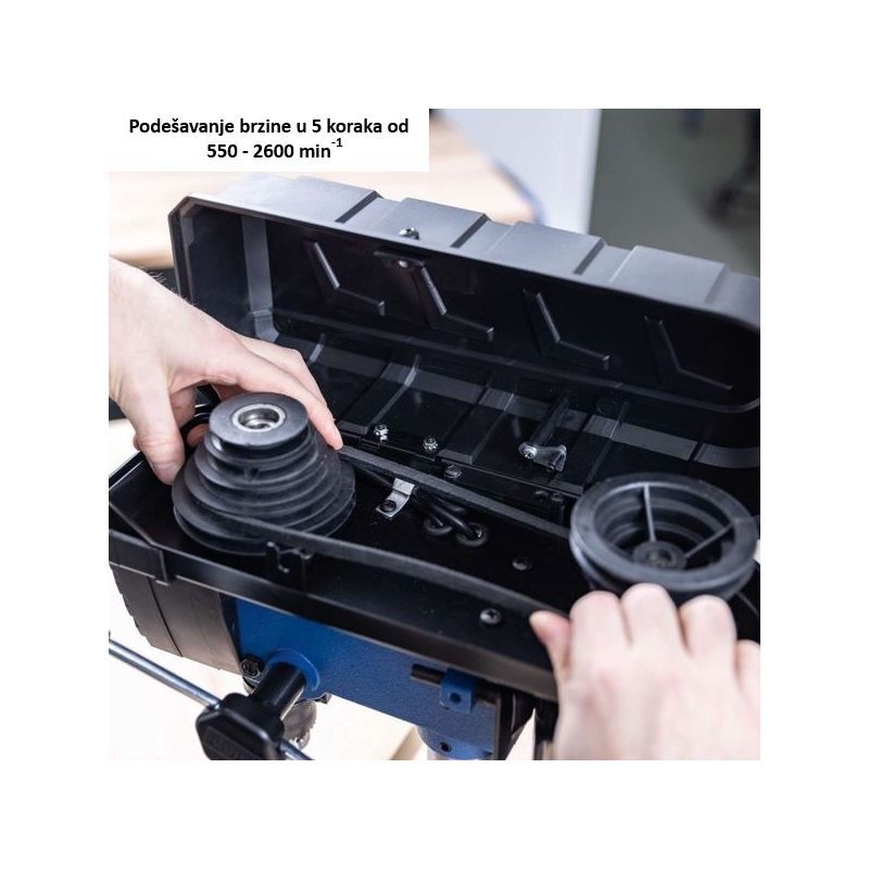 • TBM200 je stolna bušilica za kontrolirano bušenje u drvu, čeliku, metalu, aluminiju i plastici. Indukcijski motor od 400 W radi mirno, a brzina se bira u 5 koraka (550 / 950 / 1450 / 1950 / 2600 o/min) prema materijalu i promjeru svrdla.