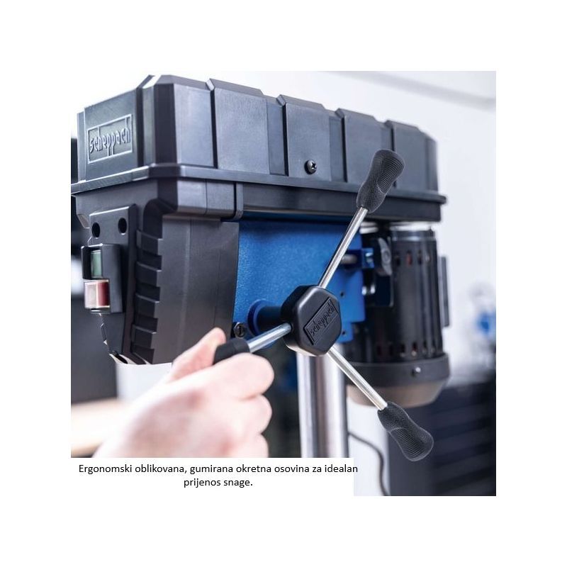 Stolna bušilica TBM200 s indukcijskim motorom 400 W i 5 brzina 550–2600 o/min. Maksimalna dubina bušenja 50 mm i grlo 102 mm za stabilno bušenje većih obradaka.