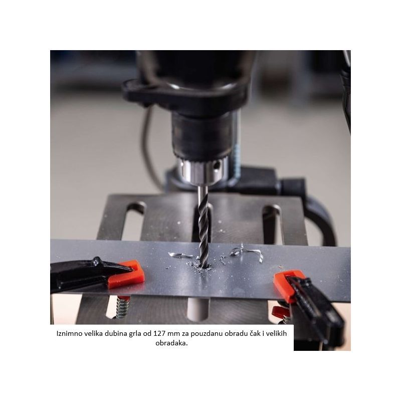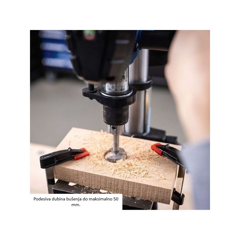 Maksimalna dubina bušenja je 50 mm. Podesivi graničnik dubine omogućuje ponavljanje iste dubine na više komada, što je bitno za serijsku proizvodnju i kontrolu kvalitete.