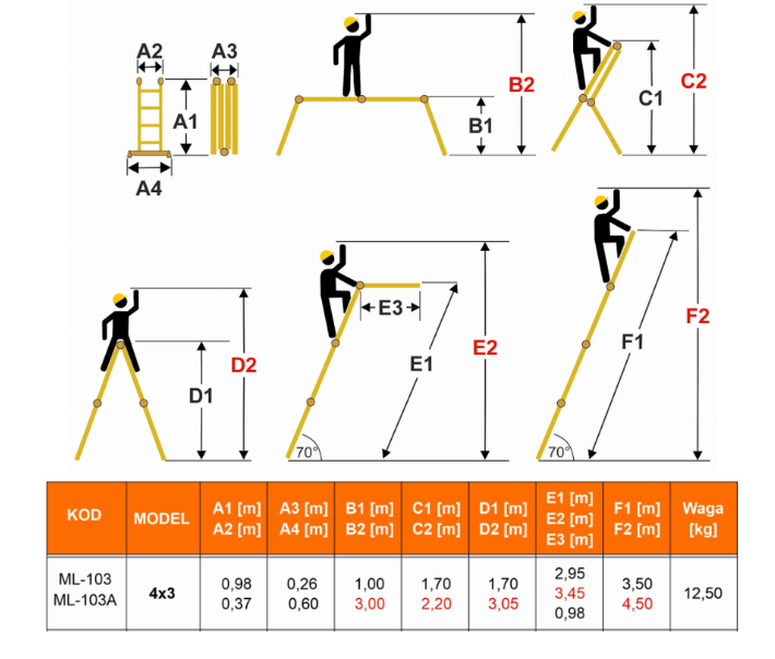 - 4x3 ML-103A su sklopive, višenamjenske zglobne ljestve izrađene od laganog i izdržljivog aluminija, namijenjene za kućnu i profesionalnu upotrebu