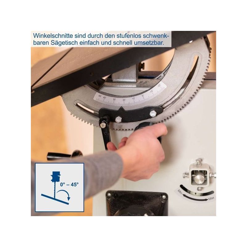 Da, stol pile može se nagnuti do 45° za precizne kose rezove.
