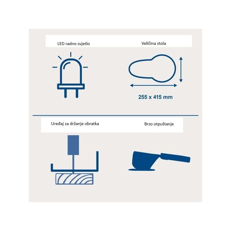 Stol je dimenzija 415 × 255 mm i izrađen je od aluminija, uz čvrstu bazu za stabilnost i niske vibracije radi preciznog piljenja. Operativno: stabilnost direktno utječe na točnost na tankim listovima i sitnim radijusima.