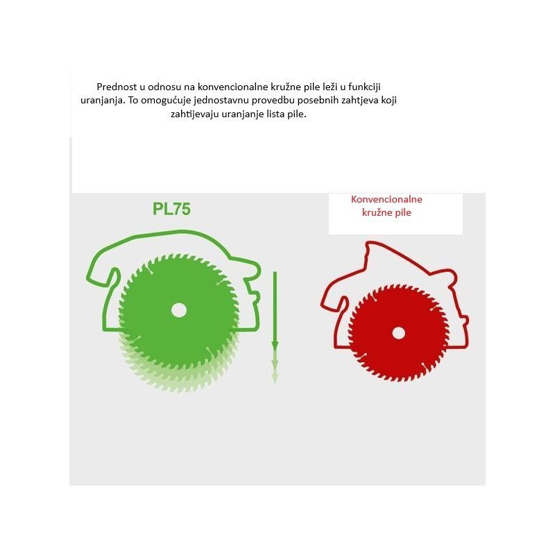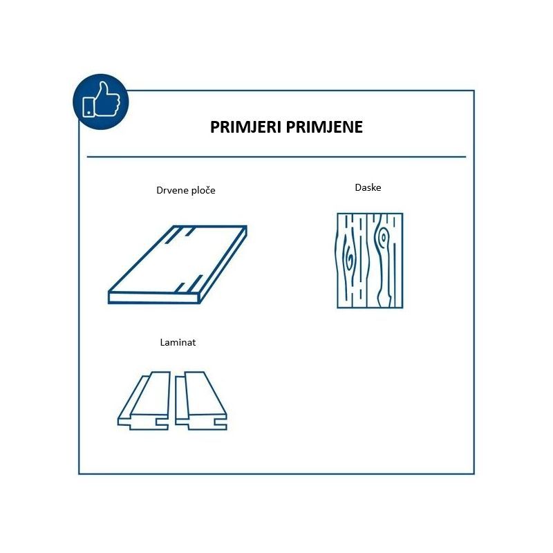 Preporučena je za masivno drvo, radne ploče, obostrano obložene MDF ploče, laminat i plastiku. Za minimalno oštećenje površine (posebno kod laminata i furnira) važni su: ispravno odabran list pile, stabilno vođenje i čista odsisna zona (manje čestica u rezu). :contentReference[oaicite:4]{index=4}