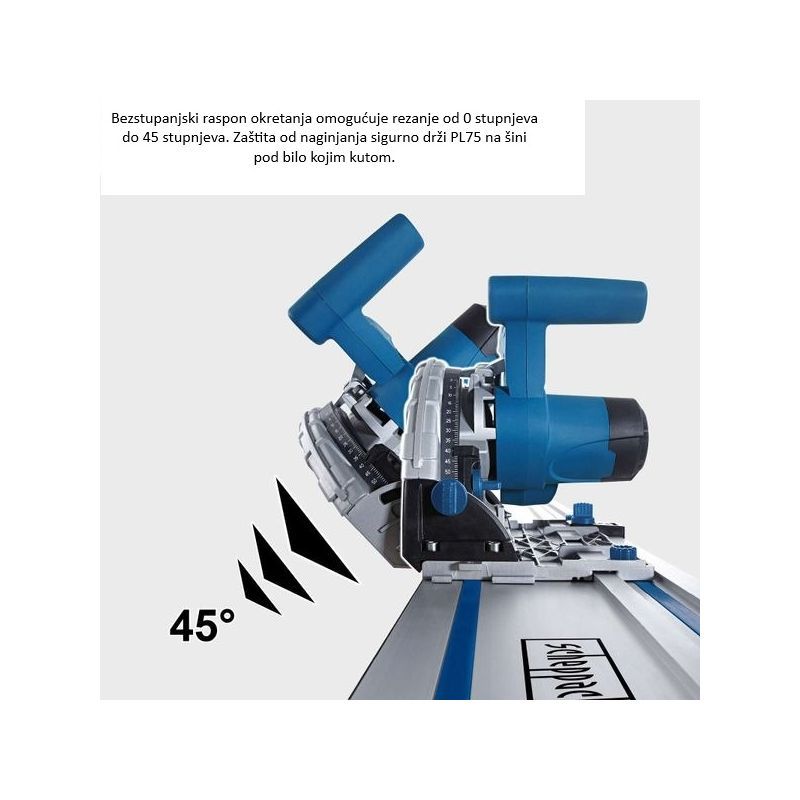 Maksimalna dubina reza je 75 mm na 90°. Na 45° maksimalna dubina reza je 55 mm. Uz vodilicu je navedeno: 70 mm na 90° i 50 mm na 45° (ovisno o konfiguraciji). :contentReference[oaicite:0]{index=0}
