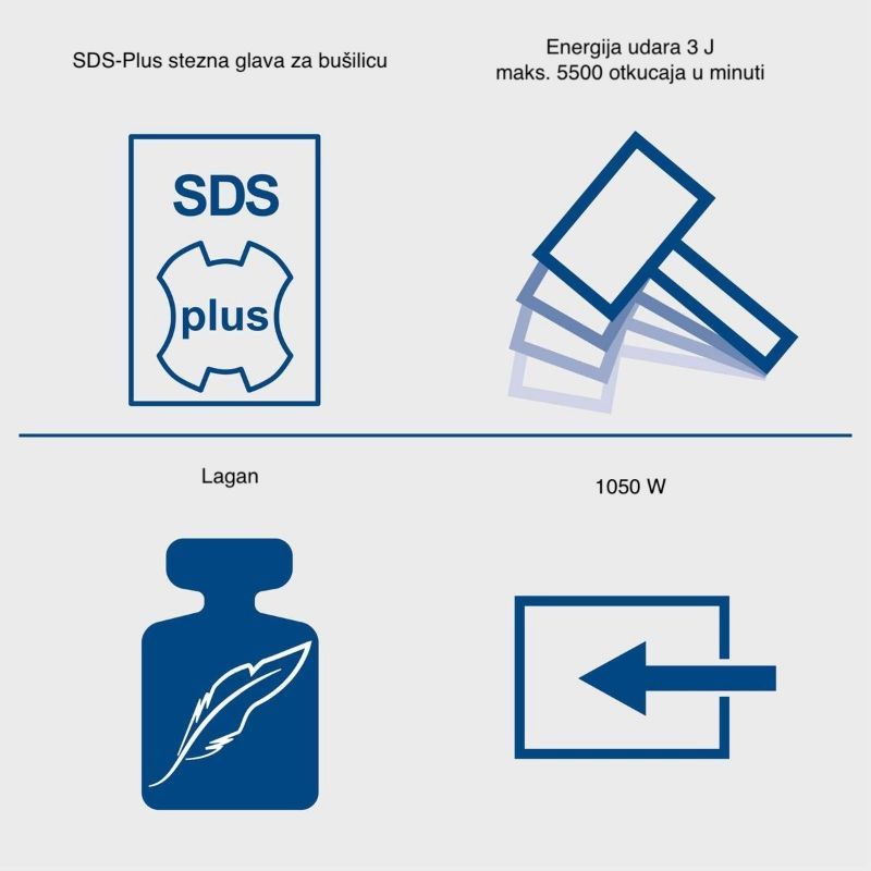 Energija udara je 3 J. Operativno: to je razina za redovite radove u betonu i zidu (tiple, kanali, manja štemanja), uz realan napredak bez pretjeranog opterećenja korisnika. Kod armiranog betona i većih promjera treba raditi u etapama i koristiti kvalitetan SDS-Plus pribor.