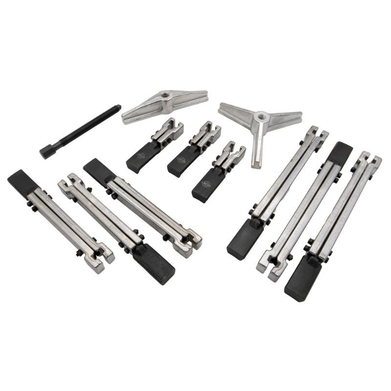 Set uključuje vijke duljina 160 mm i 270 mm za prijenos sile izvlačenja. Duži vijak se koristi kada trebate veći hod ili kada su čeljusti postavljene dublje; kraći daje kompaktniji zahvat. Operativno: vijak mora ostati centriran u osi kako bi izvlačenje bilo ravnomjerno i bez klizanja.
