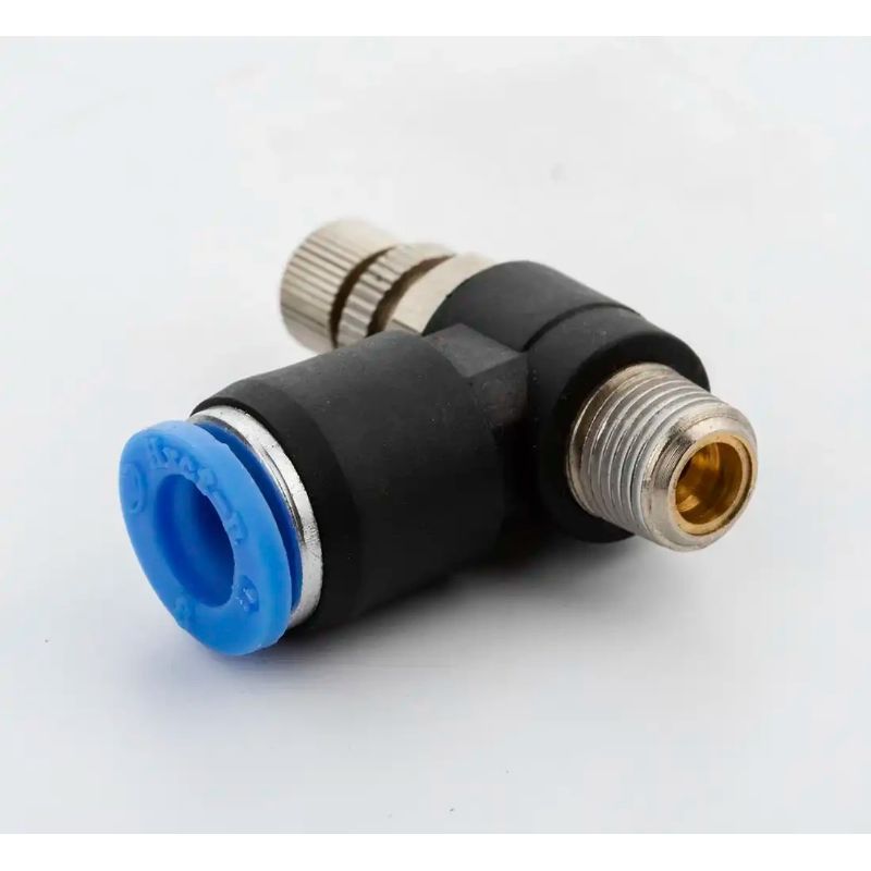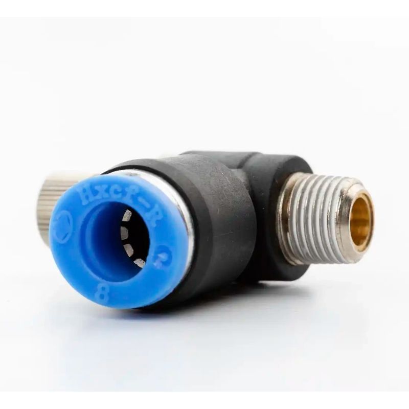 Priključak s prigušnim ventilom za crijevo 8 mm s navojem 1/8" osigurava pouzdano spajanje pneumatskih crijeva i kontrolu tlaka, kompatibilan s montažnim strojevima za gume M-220 i M-221.