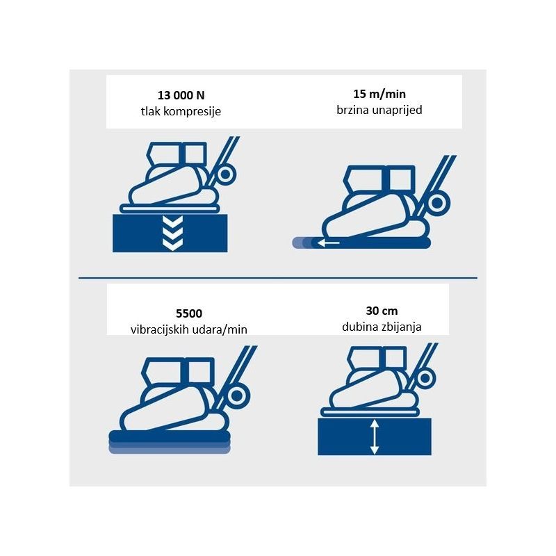 Sila zbijanja je 13 kN (13.000 N). Deklarirana dubina zbijanja je 30 cm (u opisu se navodi i 35 cm; za konzistentnost prema nazivu artikla i istaknutim podacima uzima se 30 cm).