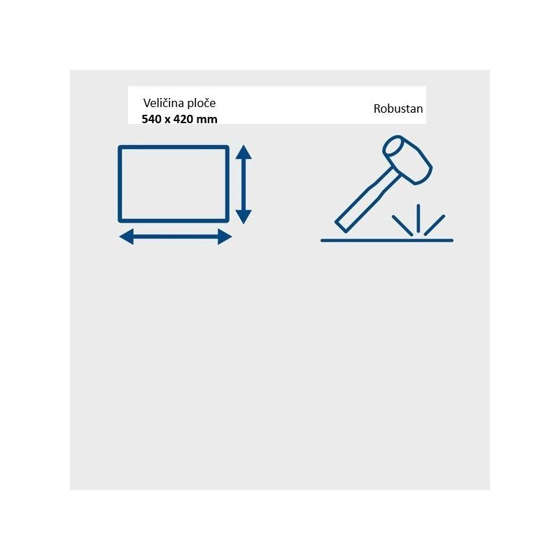 Veličina ploče je 540 × 420 mm (širina ploče 420 mm). Šira ploča pokriva više površine po prolazu, što ubrzava zbijanje ravnih dionica (prilazi, staze), dok dimenzija i masa zadržavaju stabilnost na granuliranoj podlozi.