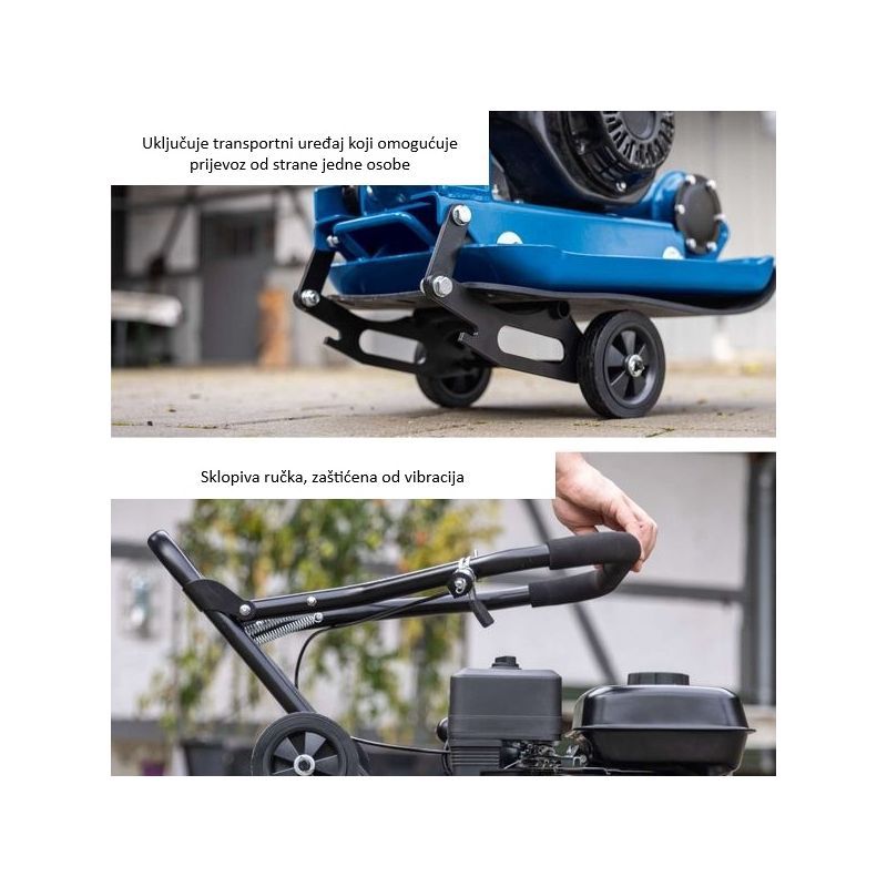 Pogon je 4-taktni benzinski motor deklarirane snage 5,6 KS. Vibroploča je racionalan izbor kada treba postići ujednačeno zbijanje podloge na većoj površini i smanjiti rizik od slijeganja (pločnici, rubnjaci, terase), gdje ručno nabijanje ne daje konzistentnu gustoću i traži znatno više vremena.