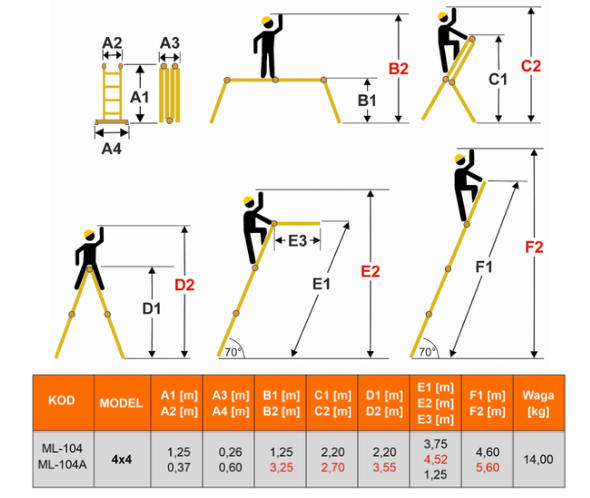 Ljestve se mogu koristiti u 7 različitih položaja – kao klasične ljestve, samostojeće ljestve, radna platforma, skela, radni most, niska stepenasta postolja i kompaktni radni stalak.