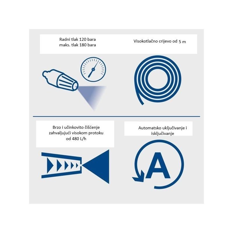 Snaga motora je 2400 W, maksimalni tlak 180 bar (u specifikaciji 18,0 MPa), a maksimalni protok pumpe 480 L/h. To je konfiguracija za kućne i dvorišne zadatke gdje trebate kombinaciju pritiska i protoka za učinkovito čišćenje.