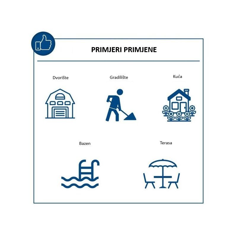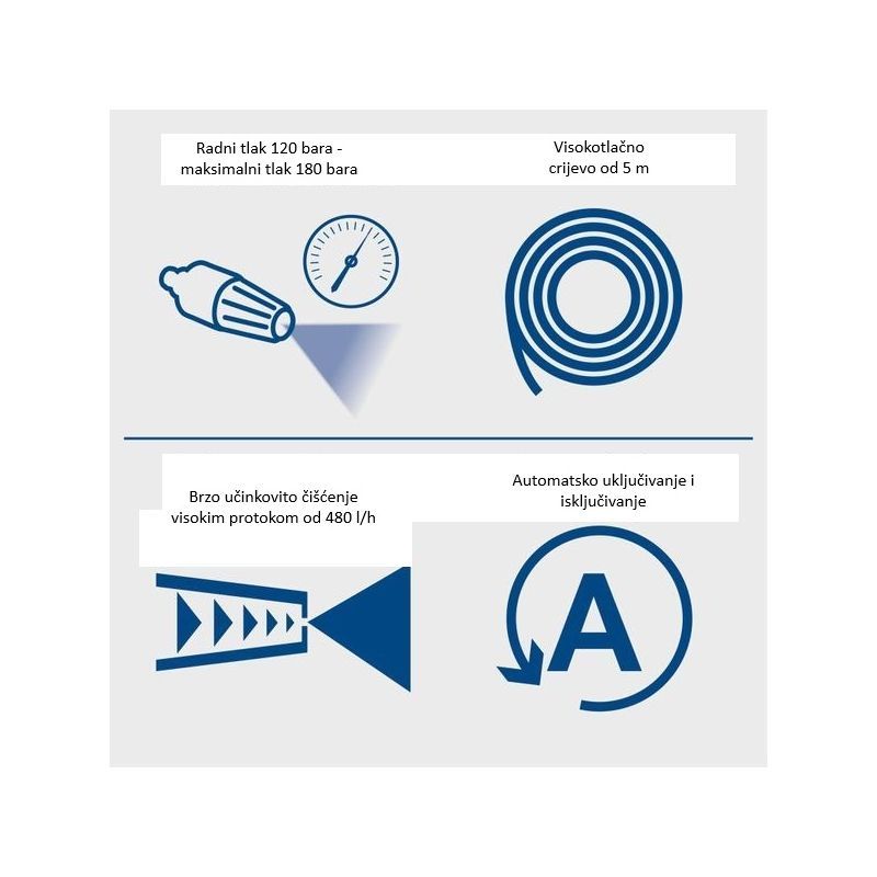 Namijenjen je za čišćenje površina oko kuće i dvorišta: terase, prilazi, kamene/betonske površine, vrtni namještaj i vozila, gdje je potreban visok tlak za uklanjanje naslaga prljavštine. Maksimalni tlak je 180 bara, što pokriva većinu kućnih i hobi zahtjeva.